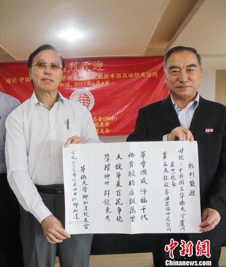 图为印尼校友(左)诗赠华侨大学母校。林永传摄