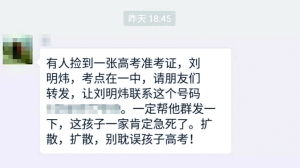 昨天,北京晨报记者在微博和微信朋友圈内看到多人转发的“刘明炜的准考证失物招领信息”,文中写道:“朋友捡到一个准考证,有认识的通知一下:姓名:刘明炜,考点:一中,考场:013,座号:11,准考证号:204101311。联系电话18735078xxx。扩散,扩散,别耽误孩子高考”。大部分转发的市民表示,并未亲身拨打电话,仅仅是善心转发。此后,记者拨打消息中的联系电话,但语音提示对方已关机。通过搜索可以看到,此号码归属地为山西。