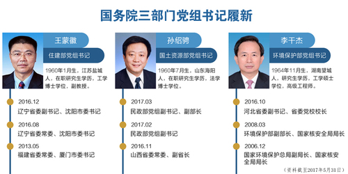 新华网北京6月6日电(记者李志强 陈淑君)5月,重要人事变动频繁。国务院三部门党组书记履新,北京市党政“一把手”调整,十省市党委完成换届,20余人新晋党委常委。此外,上海、海南、贵州等八省份先后公布出席党的十九大代表名单。