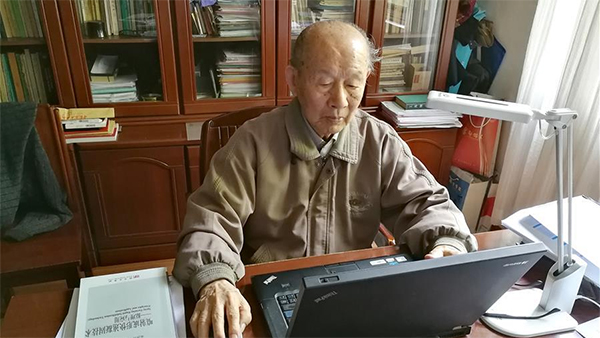 2017年5月2日,崔崑院士在位于武汉的家中使用电脑修订专著。 (图片来源:新华网)
