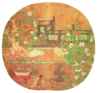 对于幼儿的?;な嵌宋绲闹匾谌荩渤晌宋缁鹊闹匾獠??;页0延ず⒂胄《锘谝黄?,放置在有蜀葵、萱花等端午花卉的背景之中。波士顿美术馆藏旧题周文矩《端午戏婴图》就是一柄有趣的宋代端午画扇?;媛鞘窨?、萱花、菖蒲。一个男孩正与两只幼猫一同嬉戏。他还在打着小鼓——鼓,正是宋代端午节重要的儿童玩具,鼓声是驱散邪气的方式。