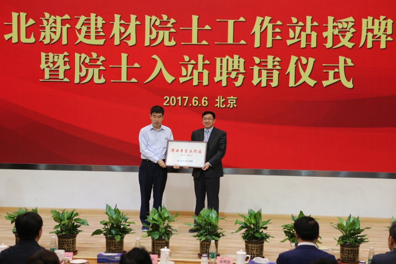 在院士工作站授牌暨院士入站聘请仪式上,北京市科学技术协会副主席徐明波向北新建材授“院士专家工作站”牌,中国工程院院士姜德生教授作为第一名入站院士接受了北新建材的聘书。姜德生院士勉励北新建材要继续保持创新引领的制高点战略不变,按照世界一流水平规划好北新科学院和院士专家工作站工作,在绿色建材、新材料、新能源、装配式建筑、智能建筑等多个领域为国家打造世界领先的科学研究和创新高地。