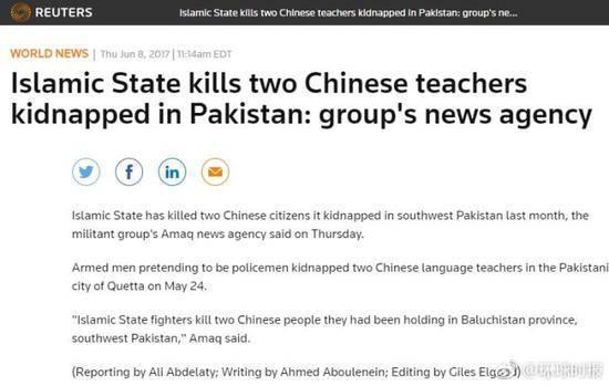 9号凌晨,路透社援引伊斯兰国(ISIS)组织新闻社的消息称,该组织杀死了上月24日在巴基斯坦西南部的俾路支省绑架的两名中国公民。