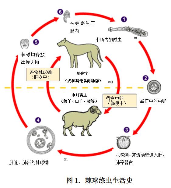 棘球绦虫的终宿主是犬、狼、狐等,中间宿主是羊、牛、猪和啮齿类免形目动物等。棘球蚴为棘球绦虫的幼虫,棘球蚴被终宿主吞食后,其所含的每个原头蚴在终宿主的肠内发育成熟并随粪便排出虫卵和孕节,可污染动物皮毛和周围的环境,包括牧场、畜舍、蔬菜、土壤及水源等。当中间宿主误食虫卵和孕节后,六钩蚴在其肠内孵出,并经肠壁随血循环进入肝、肺等器官,经过3-5个月发育成棘球蚴。犬等终宿主吃了感染棘球蚴的中间宿主病变脏器后,棘球蚴在终宿主体内发育为成虫,从而完成整个生活史(见图1)。