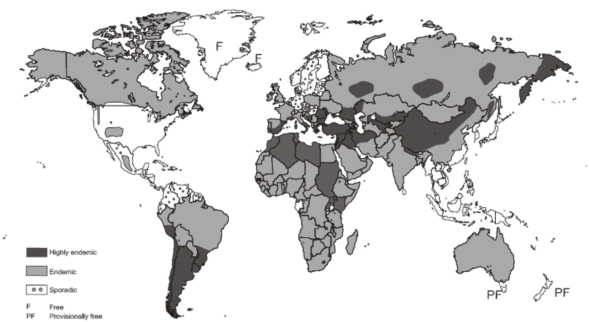 图2. 囊型包虫病的全球分布(WHO/oie)
