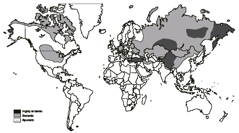 包括俄罗斯联邦大片地区和邻近国家(白俄罗斯, 乌克兰、摩尔多瓦、格鲁吉亚、亚美尼亚、阿塞拜疆、乌兹别克斯坦、哈萨克斯坦、土库曼斯坦、塔吉克斯坦、吉尔吉斯斯坦);中国的西部地区,日本北海道,土耳其伊朗和印度北部;北美洲的流行区包括阿拉斯加(美国)和加拿大的北部冻土地带,及加拿大3个?。ò⒍铩⑷箍Τ刮?、马尼托巴)的部分中北部靠南地区及美国的13个州(蒙大纳、怀俄明、南、北达科他、内布拉斯加、明尼苏达、爱荷华、威斯康辛、密西根、密苏里、依利诺斯、印地安那和俄亥俄),其范围有扩大的迹象。