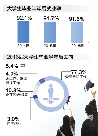 第一,大学毕业生就业率总体稳定。关于大学生毕业半年后的就业率与2016届大学生毕业半年后去向的具体数据见右图。