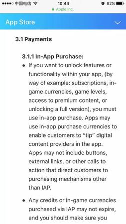1、 更新版《App Store审核指南》指出:如果开发者想在iOS软件提供下述功能(比如用户订阅、游戏内虚拟货币、游戏级别、获取高端会员内容、或者提供完整功能版本等),则开发者必须使用软件内购买。即,打赏之类,必须使用苹果支付渠道。