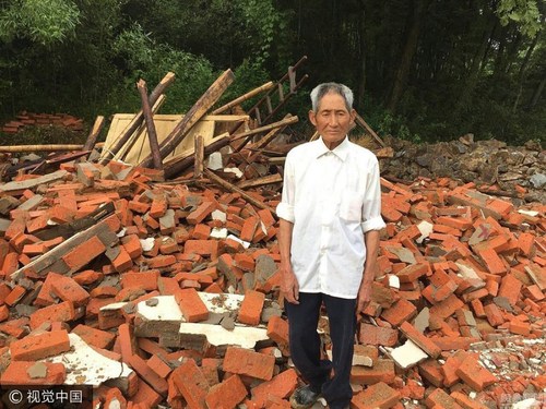 2017年6月9日夜晚,安徽省六安市,金寨县梅山镇龙湾村杨冲组73岁的独居孤寡老人叶照枝的房屋被当地修路的施工人员用铲车全部推倒。刘容海/视觉中国