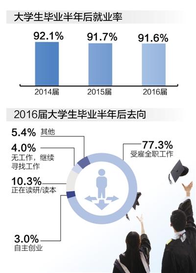 第一,大学毕业生就业率总体稳定。关于大学生毕业半年后的就业率与2016届大学生毕业半年后去向的具体数据见右图。