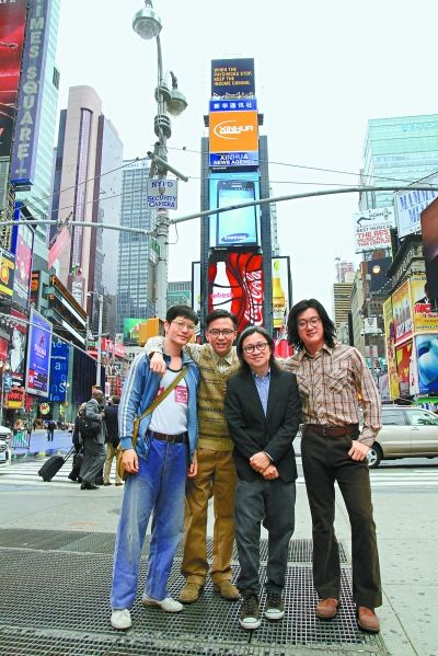在纽约时报广场拍《中国合伙人》时,陈可辛跟主演黄晓明、邓超、佟大为合影。