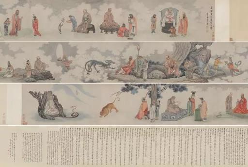 明代画家吴彬的《十二尊者相》颇为精彩,卷中人物有三十余人,神态各异,栩栩如生。吴彬将佛教信仰与日常生活紧密结合,创造了独具一格的佛像样式,从而在画史上占据了重要的地位。