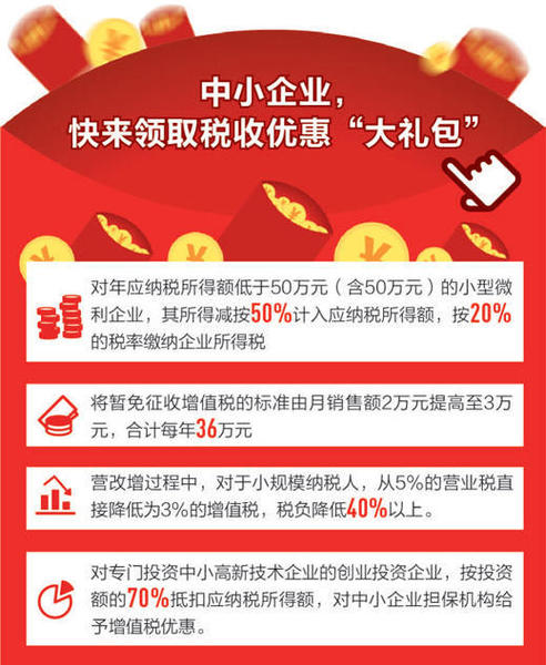 同时,财政部与国家税务总局近日发布《关于扩大小型微利企业所得税优惠政策范围的通知》,将小型微利企业的年应纳税所得额上限由30万元提高至50万元。这是中央政府再次向小微企业实实在在派出“礼包”。此次调整之前,小微企业所得税优惠政策适用范围已经过3次扩围,据国税总局统计,仅至2016年末,全国就已有1100多万户小型微利企业享受到了所得税优惠政策,其累计减免税额已近600亿元。
