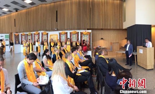 当地时间6月12日,“感知中国·大美青海”摄影、唐卡艺术展挪威首都奥斯陆世界500强的阿克集团总部开幕。图为非物质文化遗产?;ご腥讼奈峤窍蚬壅姑裰诮步馓瓶?。文飞摄