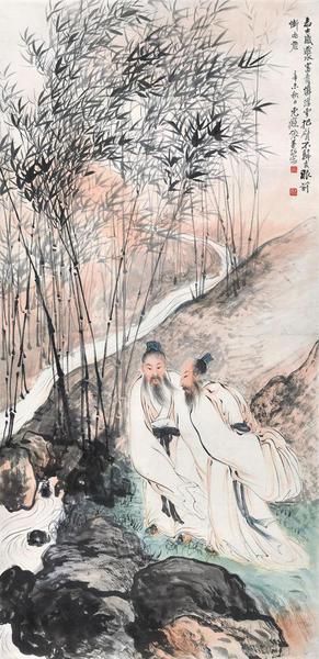 张善孖以擅长绘老虎而闻名于世,山水、人物画则不太多见,此幅即是他的人物作品。作品的气息非常好,高士的形象清癯、衣纹线条粗细有变,仿佛随风飘拂,真有吴带当风之势。