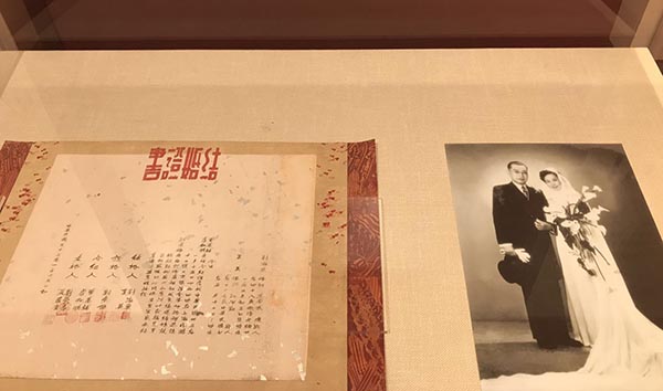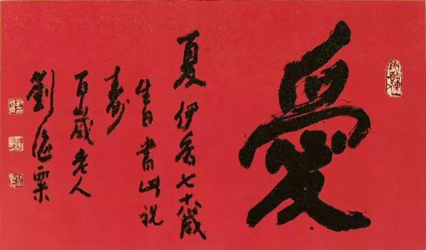1994年6月19日,在夫人夏伊乔寿宴上,刘海粟说:“鲜花、蛋糕你们准备,我送一颗爱她的心”,随后海老在一张洒金红宣纸上挥笔写下“爱”字,并题写了“夏伊乔七十八岁生日,当此祝寿。百岁老人刘海粟”。这一幅作为曾经悬挂在刘蟾(刘海粟、夏伊乔小女儿)客厅墙上的擘窠大字书法“爱”字,如今作为“沧海伊人——纪念夏伊乔诞辰100周年”专题展的重要展品陈列在刘海粟美术馆展厅。