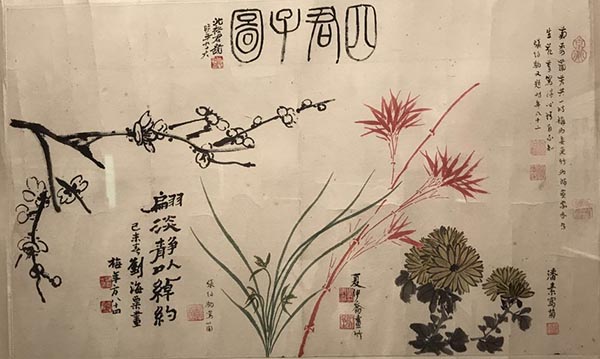除此之外,一幅1979年所绘的《四君子图》值得一提,这幅画中夏伊乔画竹,潘素画菊,张伯驹画兰并题,海老画梅,沈裕君题篆书“四君子图”四字。颇具意义地表达了当时的文人交往。而在小女儿刘蟾看来,“父母画竹子,代表了他们的气节和挺拔坚韧的意志力。而母亲正是喜欢父亲‘竹子’般的气节,所以他们画的竹子都是挺拔的,完全出自于一种精神的表现。”