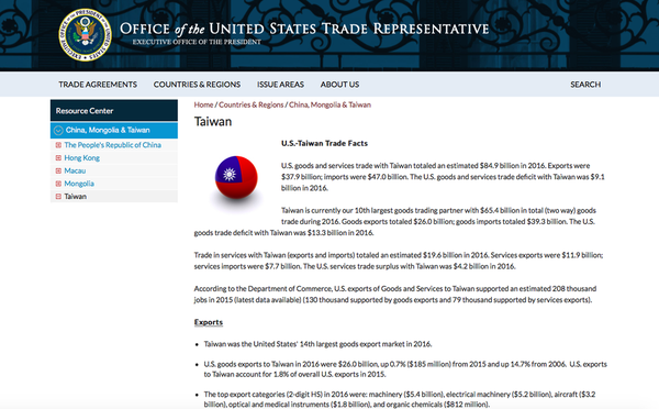 因为这个美国官方贸易部门,美国贸易代表署(USTR)官网上,台湾媒体见到了让他们甚为欣喜的“青天白日满地红旗”。