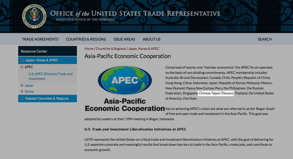 USTR网站上在介绍亚太经合组织(APEC)页面上,将“中华台北”写为“Chinese Taipei (Taiwan)”