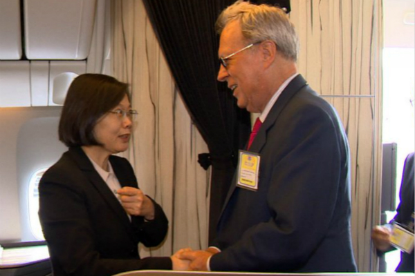 图为蔡英文此前出访时过境美国AIT理事主席薄瑞光接机资料图。
