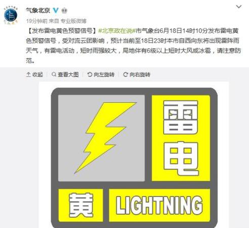 中新网6月18日电 北京市气象台今日14时10分发布雷电黄色预警信号。气象台称,受对流云团影响,预计当前至18日23时本市自西向东将出现雷阵雨天气,有雷电活动,短时雨强较大,局地伴有6级以上短时大风或冰雹,请注意防范。