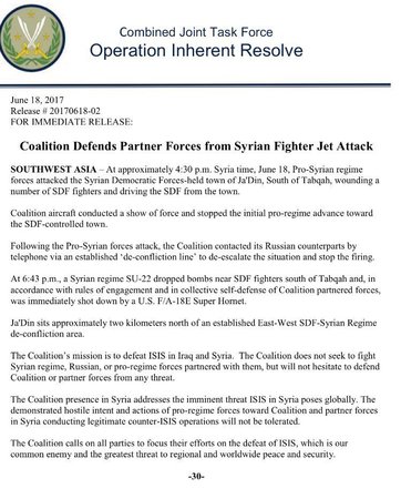 美军F-18战机击落1架叙利亚政府军苏22战斗轰炸机