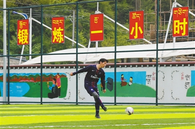 林芝市米林县全民健身广场上踢球的足球爱好者。