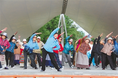 在拉萨市宗角禄康公园晨练的老年人。