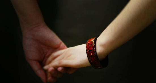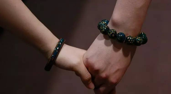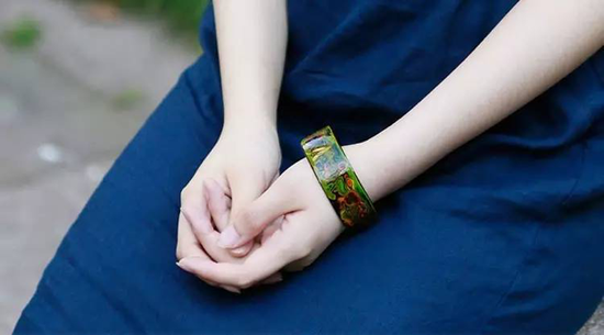 您所看到的均为王炳根先生和夫人陈小霞女士(非遗传承人)设计的手镯,颜色非常丰富微妙,绿色块里有不同层次的绿,蓝与红也如此。其中每一种色彩都需要多遍的色漆,每一只手镯都需要108道工序。