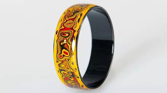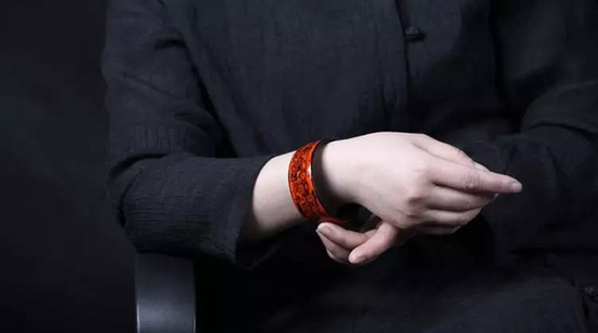 以此款手镯为例。因粘有螺钿所以凹凸不平,再以各种对比鲜明的色彩分层涂漆,形成色层丰富的漆层,再用不同的器材打磨光滑,方才显出绚烂而和谐的菩萨云纹,天然流动,色泽灿烂,非常美观。