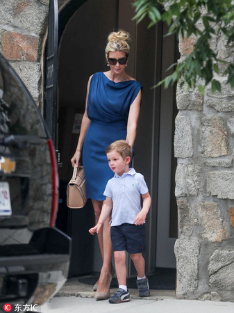 当地时间2017年6月19日,美国华盛顿,美国总统特朗普的女儿伊万卡离家,一身蓝色无袖长裙现身吸睛。