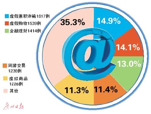 猎网平台发布的数据显示,2017年上半年,从所有举报的诈骗案情来看,猎网平台共收到全国用户有效申请的网络诈骗举报10882例,虚假兼职诈骗依然是举报数量最多的类型,共举报1617例,占比14.9%;其次是虚假购物1539例(14.1%)、金融理财1414例(13.0%)、网游交易1236例(11.4%)和虚拟商品1226例(11.3%)。