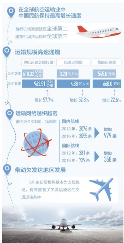运输网络越织越密,尤其国际航班连年保持两位数增长。截至2016年底,我国各航空公司共开通国内定期航线3055条,比2012年的2076条增长47.2%,定期航班国内通航城市达到214个。国际航线增长更为迅猛,从2012年的381条增至2016年底的739条,增长94%?!?a target="_blank">一带一路”沿线更成为国际航班开放热点,2016年沿线航班班次量比2012年增加逾100%,目前每周定期航班4551班。