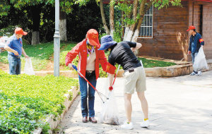 志愿者清理卫生死角。