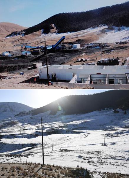 上图为2017年1月18日拍摄的祁连山国家级自然?;で谟啦芈碛得嚎笙氯悼笄缓啪吻熬跋螅幌峦嘉?017年2月8日拍摄的下泉沟矿区一号井整治后景象 范培珅/摄
