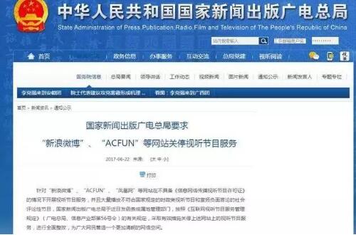国家新闻出版广电总局22日通报,“新浪微博”“ACFUN”“凤凰网”等网站在不具备《信息网络传播视听节目许可证》的情况下开展视听节目服务,并且大量播放不符合国家规定的时政类视听节目和宣扬负面言论的社会评论性节目,被关停视听节目服务。(6月22日新华社)