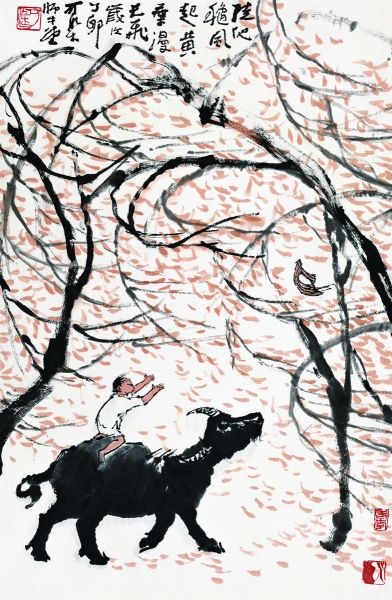 牛的题材虽有单一性,可父亲总会出其不意地表现出不同境界与看点。例如,《牧韵图》中,他表现了盛夏时分,浓荫树下,牧童甩掉鞋子,躺靠在树干吹笛,牛伴着笛声酣睡,一片和谐惬意的场景;《秋风吹下红雨来》中则描绘了秋天落叶中牧童在牛背上追逐的画面,灿烂生动;80年代创作的《林茂鸟竞归》描写的是牧童在归途仰看着成群的鸟盘旋着要回到浓郁的树林里栖息的情景,寓意祖国的强大定会吸引大批海外学子归来。他在抓住题材、内容丰富性的同时,不断锤炼笔墨表现的单纯性、整体性、书写性和写意性,以增强画的感染力。