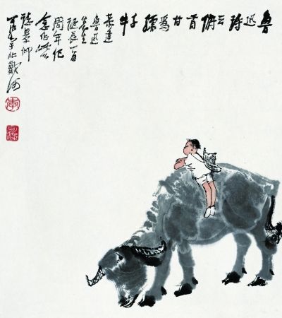 父亲晚年多次画的题材“五牛图”中题有“牛也力大无穷,俯首孺子而不逞强,终生劳瘁,事而不居功,纯良温驯,时亦强犟,稳步向前,足不踏空,皮毛骨角无不有用,形容无华,气宇轩宏。吾崇其性爱其形,故屡屡不倦写之”,其中“足不踏空”正是他的人生观与艺术态度的写照,与“实者慧”一样成为他人生感悟的铭志。父亲画牛更多是表现他纯真浪漫带有幽默的天性。他早期画牛以线为主,潇洒、写意,喜欢表现牧童嬉水、牧童戏鸟等题材,如田园牧歌,充满了文人气息。父亲拜齐白石为师后,在老人身边深深感悟到了笔墨表现的真谛,有感于老师能敏感而大胆地抓住生活中的新鲜感受,以特殊性的笔墨表现其韵味。白石老人艺术的创造性给了父亲很多启示,在父亲画的牛里可以看到他从老师画的虾、蟹中吸取到简洁笔墨的韵味,画牛的意境绝不简单承袭古人,而是把更个人化的新鲜感受汇集到画面中。