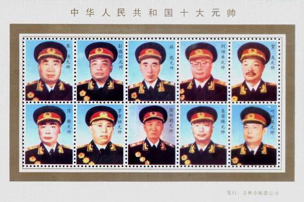 从1986年3月22日起,至1999年12月29日,历时13年,除林彪外的九大元帅,全部以名人诞辰纪念为题搬上邮票。共发行九套邮票。在收藏者看来,如果把1955年授衔的十大元帅放在一起,发行一枚具有特殊纪念意义的小型张或者小版张,应该具有独一无二的收藏价值,当然,这将是永远无法实现的了。如今,我们只有从吉林省邮票公司发行的小版纪念张上,略窥一下十大元帅在一起的珍贵画面。