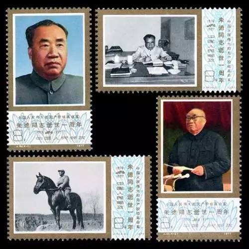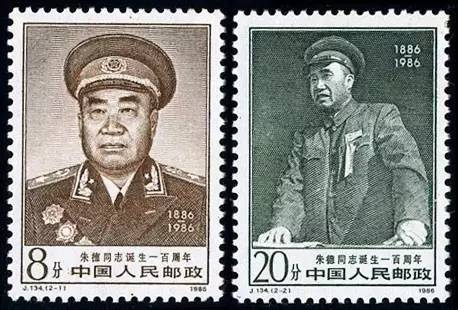 1977年7月6日为纪念朱德元帅逝世一周年,邮电部发行J19“中国人民伟大的无产阶级革命家朱德同志逝世一周年”纪念邮票一套4枚。1986年12月1日邮电部发行J134“朱德同志诞生100周年”纪念邮票一套2枚,版别为雕刻版,是1974—1991年“人物邮票”中唯一一套纯雕刻版邮票。其实,在此之前,朱德同志作为解放区我军总司令,在40年代战时邮政期间,各解放区曾先后发行朱德邮票117枚。其中,山东战时邮政总局在1945年9月最早发行朱德邮票。