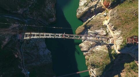 两崖夹石如劈,施工单位中铁大桥局的该项目负责人田大千说,受特殊地理环境和气候所限,澜沧江特大桥是世界上第一次采用“二次竖转”施工的大桥,也是世界上竖转下放重量最大的桥梁,2500吨的下放重量相当于50节满载火车皮?!安唤锌?在古时的‘悬崖奇渡’上方,现代科技最终战胜了天险?!?/p>