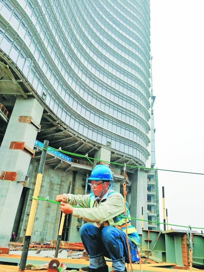武汉绿地中心设计高度636米,是在建的“华中第一高楼”,由中建三局承建,中建钢构负责其钢结构部分的施工。项目部安全总监严贝说,作为中建总公司的重点项目,武汉绿地中心的安全生产要求更为严格。