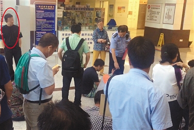 挂号大厅,一名号贩子(圆圈处)被民警认出,让其站在一边,等待被带离。