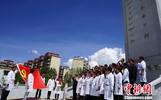 西藏自治区藏医院医护党员在拉萨烈士陵园革命烈士纪念碑下重温入党誓词赵延摄