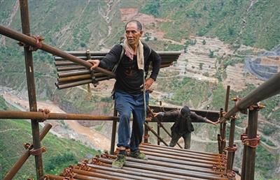 6月17日,悬崖村,60多岁的村民伍有则背负着10根总共一百多斤的钢管,在攀登钢梯,这些钢管被用来维护钢梯,填补一些缝隙较大的地方。