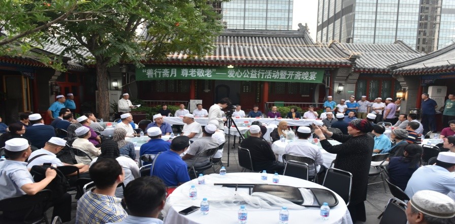 6月9日,北京市伊斯兰教协会在东直门外清真寺举行“善行斋月·尊老敬老”爱心公益活动暨开斋晚宴?;疃殖。渎排ㄅǖ墓匕?、祥和之气。