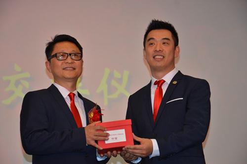 上届会长余光金(右)与新会长王永成(左)交接印章。