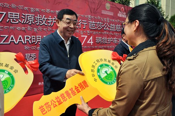 本站综合西藏日报消息:6月22日,由中华思源工程扶贫基金会、西藏自治区人民政府主办,中共西藏自治区委统战部、西藏自治区卫生计生委、拉萨市人民政府承办,思源?芭莎公益慈善基金、思源?天使妈妈基金协办的“2017思源救护西藏行、芭莎公益慈善基金2016BAZAAR明星慈善夜74辆救护车发车仪式暨雪域光明行”活动在拉萨市西藏人民大会堂举行。全国政协副主席、民建中央第一副主席马培华出席活动并为“思源?雪域光明行”医疗队授旗,中共西藏自治区委副书记、人民政府主席齐扎拉出席活动并讲话。中共西藏自治区委常委、统战部部长旦科等自治区领导出席本次活动。中华思源工程扶贫基金会常务副秘书长陶鸣宣读受助医院名单。