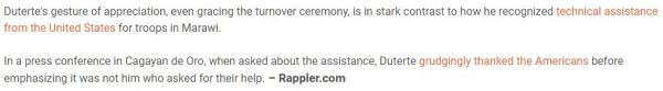 菲律宾媒体报道截图:杜特尔特“很不情愿地”对美方表示感谢。