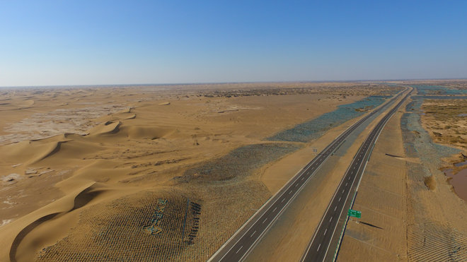 京新高速临白段(阿盟境内),合同额86.5亿元,主线长约357.84公里。项目地处巴丹吉林沙漠北麓,穿越200多公里无人区,常年风沙肆虐,无路、无水、无电、无信号、无人烟,施工环境异常艰苦。自2015年1月初进场以来,中国交建先后有13000余人、5000多台套机械设备挺进大漠戈壁,形成了“大兵团作战”的排兵布阵。他们克服气候环境恶劣,有效施工期短等困难,经过300多天夜以继日的奋战,率先实现全线贯通目标,比计划工期提前50多天。